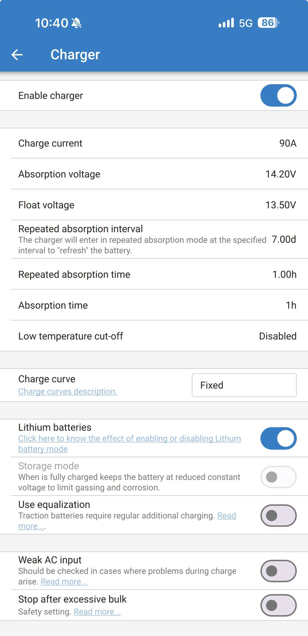 Tap on Battery preset and select "Smart Lithium LiFePO4" which is the Victron default for lithium and will work almost perfectly for Roamer batteries, we simply recommend you reduce the absorption time to 30-60 minutes instead of the default 2 hours and reduce storage voltage to 13.25V. Cable resistance can affect when the battery enters absorption mode and while 30 minutes absorption is usually sufficient to fully charge the battery, if you find that the battery is still accepting charge current at the end of the 30 minute period, you can increase this to 60 minutes. To make these changes, follow the steps below: